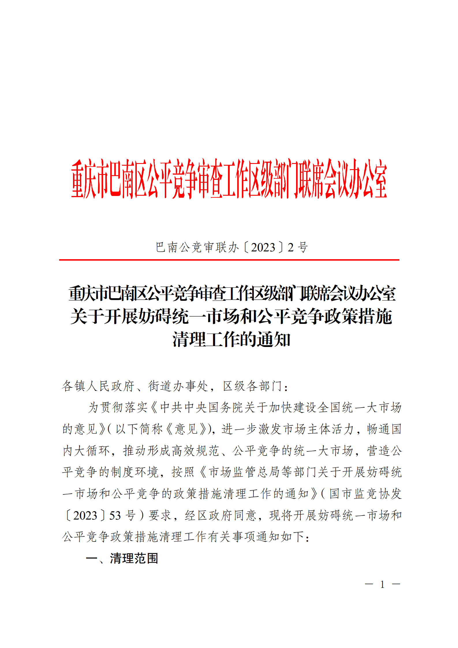 重庆市巴南区公平竞争审查工作区级部门联席会议办公室关于开展妨碍统一市场和公平竞争政策措施清理工作的通知