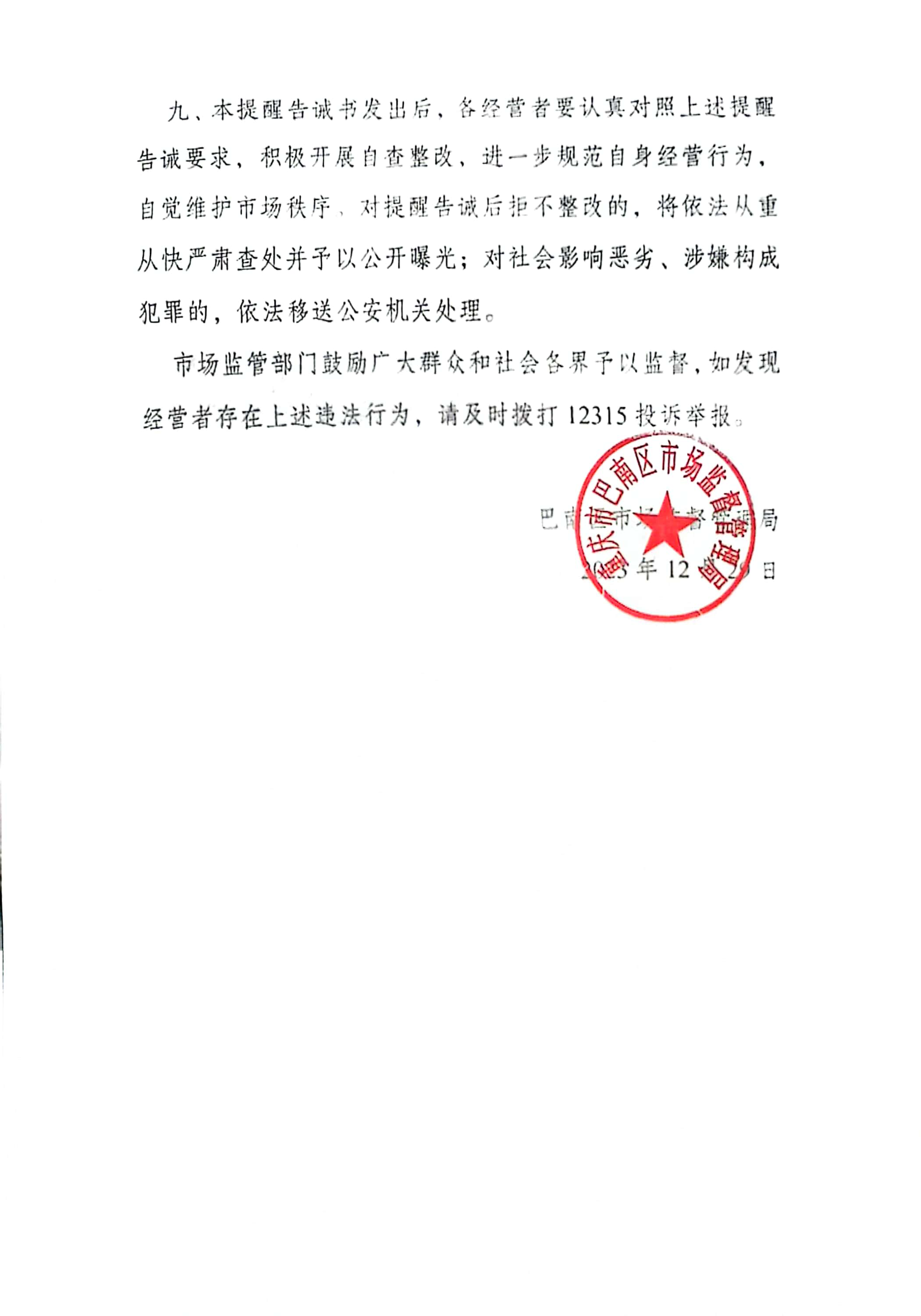 巴南区市场监管局发布元旦节、春节期间重要民生商品稳价保质提醒告诫书