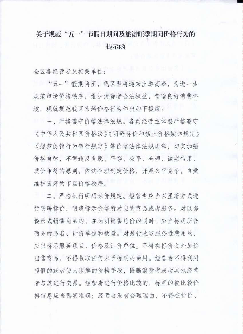 关于规范“五一”节假日期间及旅游旺季期间价格行为的提示函