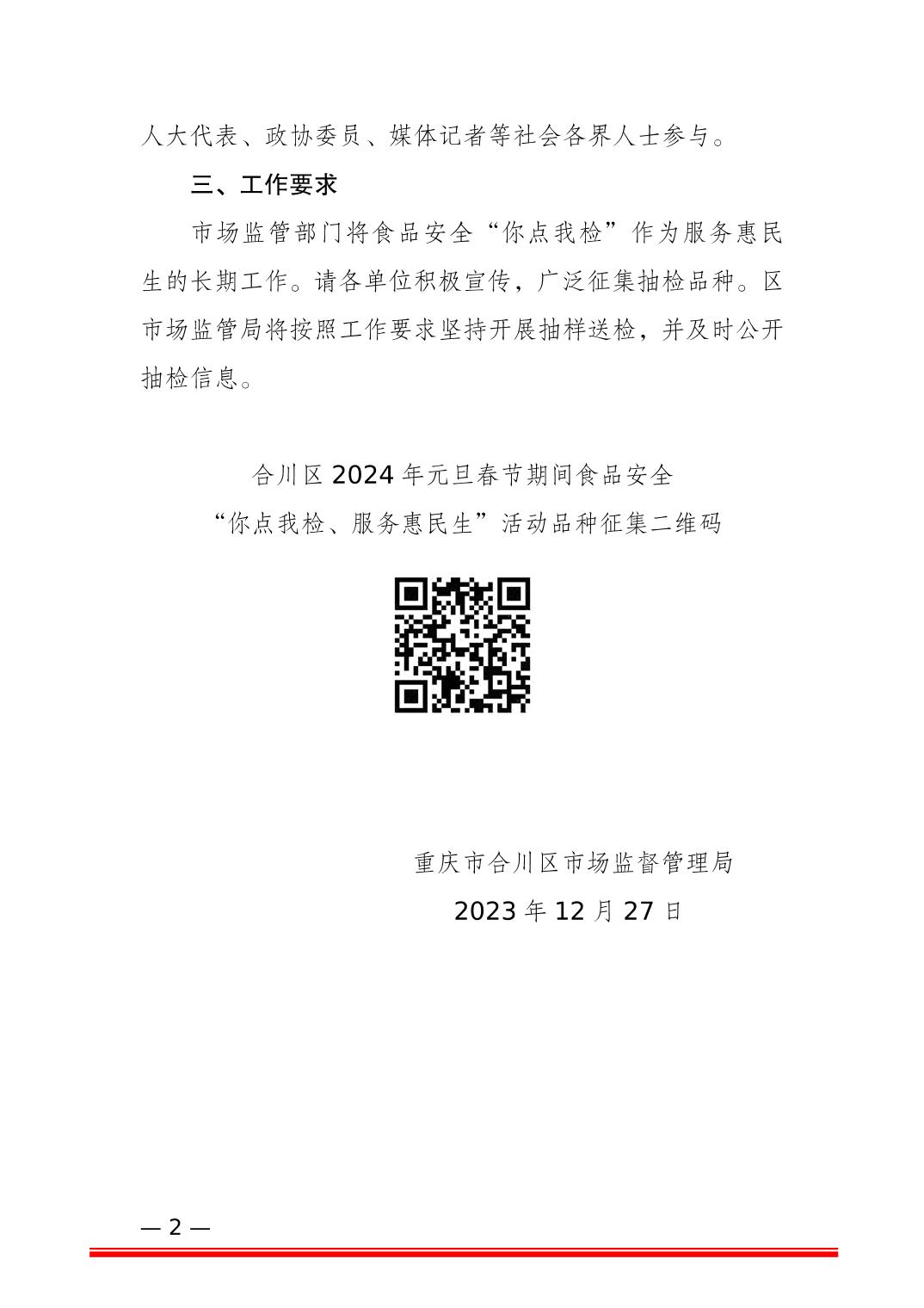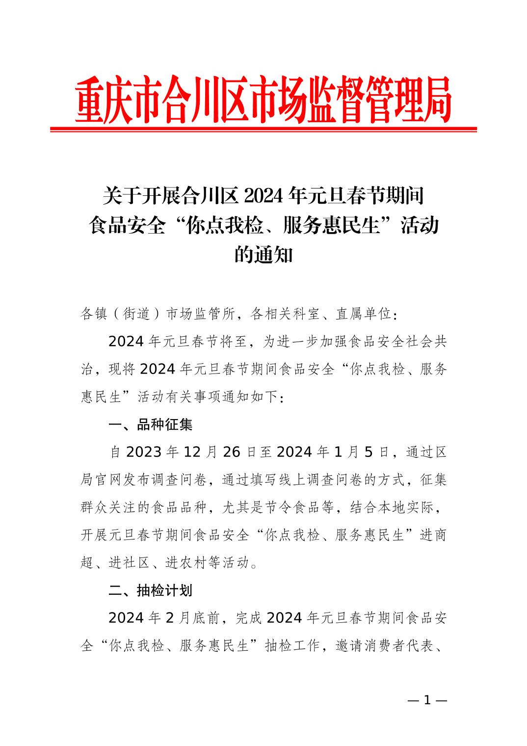 关于开展合川区2024年元旦春节期间 食品安全“你点我检、服务惠民生”活动 的通知
