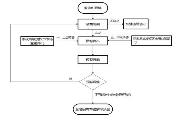 一级或二级预警由市市场监管部门组织有关部门和机构、专业技术人员及专家进行会商研判,预估可能的影响范围和危害程度,向市政府提出预警级别建议。一级或二级预警信息由市政府或授权市市场监管部门发布。三级或四级预警由区市场监管部门组织有关部门和机构、专业技术人员及专家进行会商研判,预估可能的影响范围和危害程度,向区政府提出预警级别建议。三级或四级预警信息由区政府或授权区市场监管部门发布。
