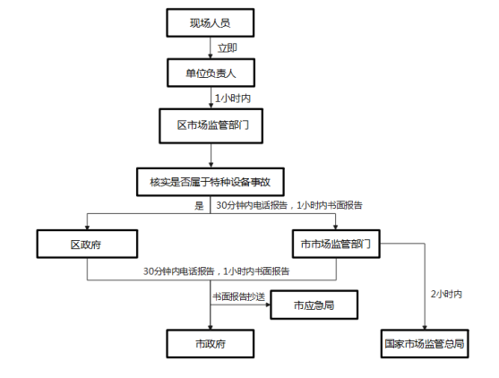 对于发生特种设备事故的,区政府、市市场监管部门要30分钟内向市政府电话报告,1小时内书面报告,书面报告同时抄送市应急局。对于特种设备事故,市市场监管局应于2小时内报告国家市场监管总局。