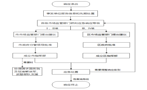 I级、II级应急响应由市市场监管部门组织会商后提出启动应急响应建议,报市政府分管领导批准决定启动I级、II级应急响应;Ⅲ级、Ⅳ级应急响由区市场监管部门组织会商后提出启动应急响应建议,报区政府批准决定启动Ⅲ级、Ⅳ级应急响应。