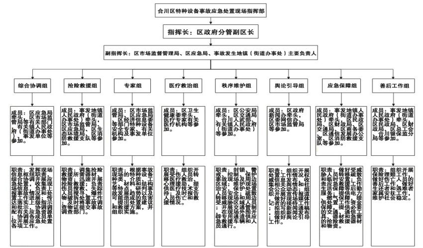区指挥部由区政府分管副区长任指挥长,区市场监管局、区应急局等部门和事故发生地镇街主要负责人任副指挥长。主要职责:组织、协调、指挥应急处置工作;传达贯彻执行国务院、市政府、区政府有关指示、命令;向国务院、市政府、区政府报告特种设备事故基本情况和应对情况;组织调度有关队伍、专家、物资、装备;决定对事故现场进行封闭和对交通实行管制等强制性措施。