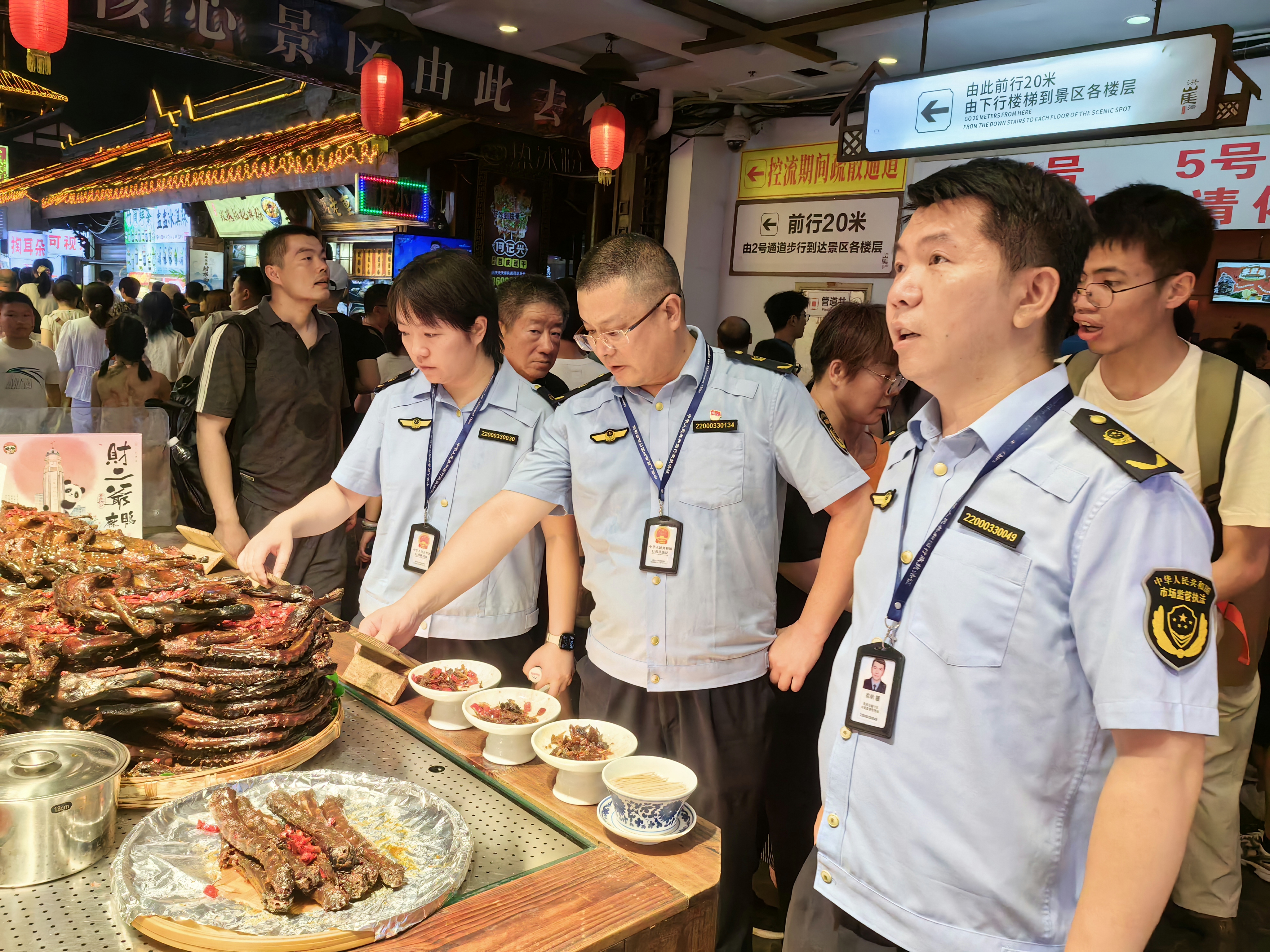 渝中区市场监督管理局联合区文旅委、区公安分局、属地街道、交通执法渝中大队等多部门开展联动执法,形成齐抓共管的工作格局。一是联合制定执法计划。针对突出问题或重点领域,共同开展专项执法行动,统一行动时间、标准和要求,在现场执法中,各部门按职责分工开展执法检查,形成工作合力。二是开展高频次检查。利用节假日、周末、重点时间段对洪崖洞景区、解放碑商圈、凯旋路、菜园坝等游客密集区域开展高频次联合执法检查。三是加强景区治理。每日参与洪崖洞景区大综合一体化执法检查,协助相关部门对景区周边旅拍揽客人员、占道经营商贩进行劝导和驱离,维护景区良好秩序。截至目前,共开展联合执法检查37次,协助相关部门规范摊点27个和驱离违规人员120人,形成了强有力的震慑效应。